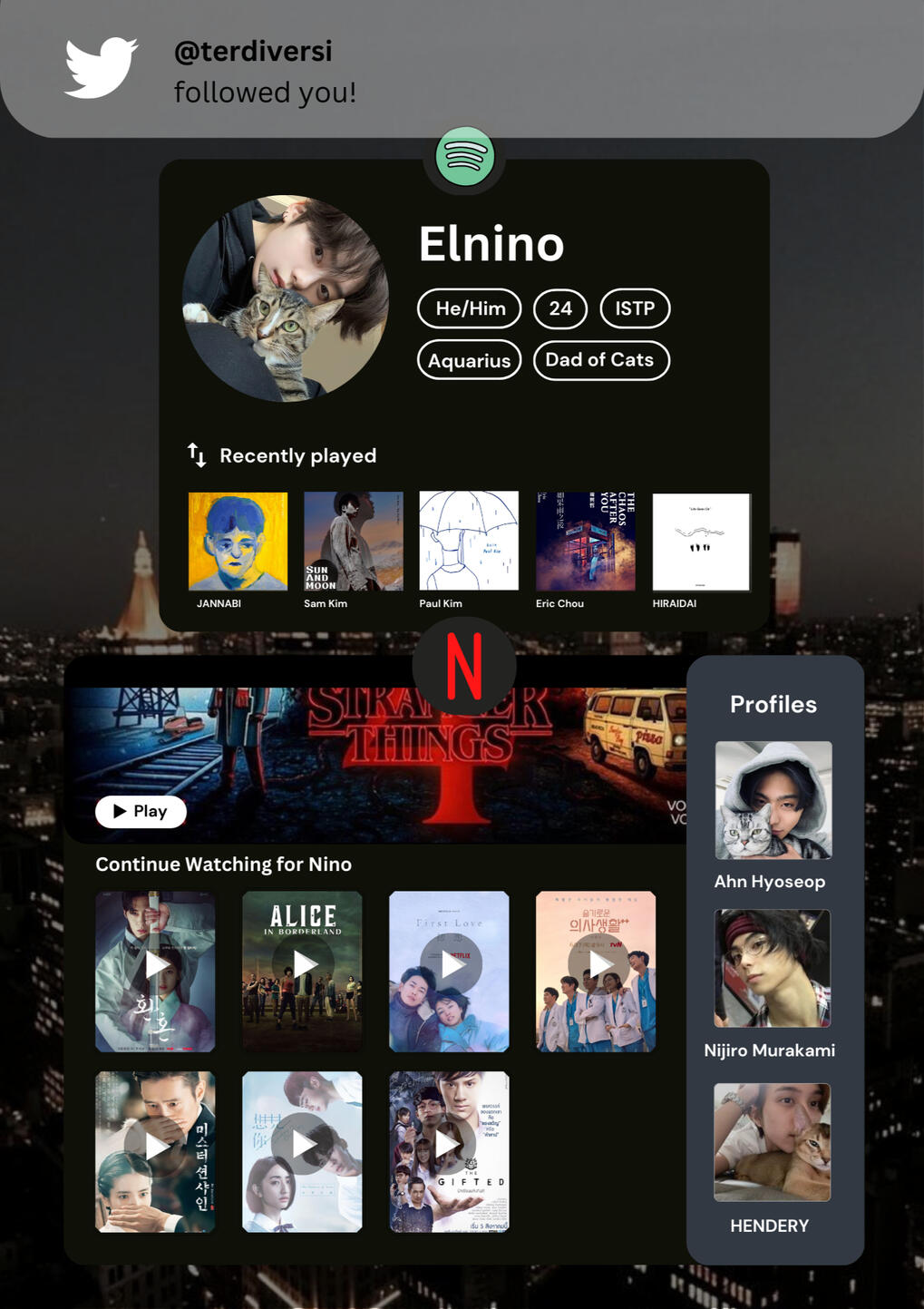 Elnino Arden Dityaputra, better known as Nino, might appear rather nonchalant and careless on the outside, but he never leaves you alone. The kind of pal who makes you feel as though you've been friends for life with his casual remarks, jokes, and annoying playful nature as soon as day #1.Upon your rants, he would curse out the cause with you, be it a thing or a living thing--most of the times, even louder than you do. He would then squeeze out his brain juice for you on how to make things better that it gets him awake at ungodly hour. When you hit a deadend, he would gladly runaway with you to chug on fun stuff.